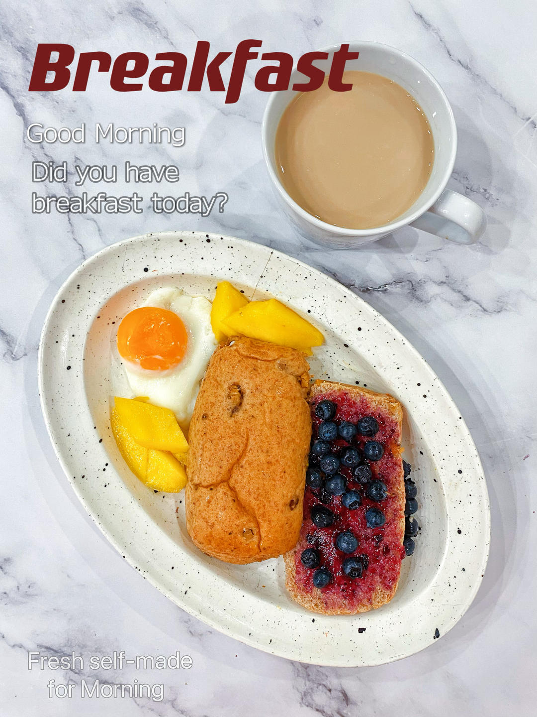 早:☕奶咖🥭🫐🍳🥯蓝莓酱全麦餐包