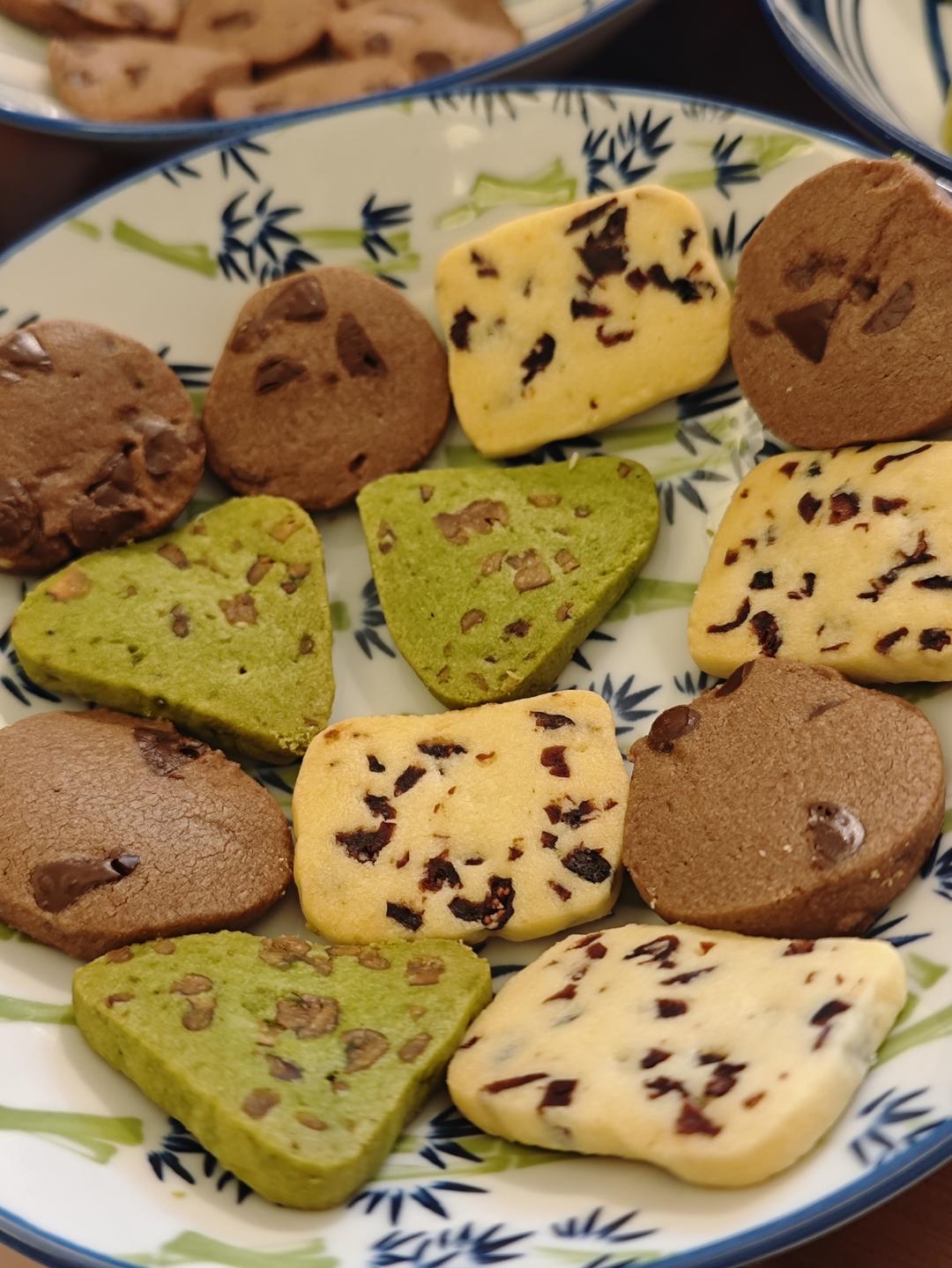 蔓越莓/巧克力/抹茶碧根果曲奇🍪130克黄油45糖粉15克全蛋液195克低筋面粉抹茶粉...