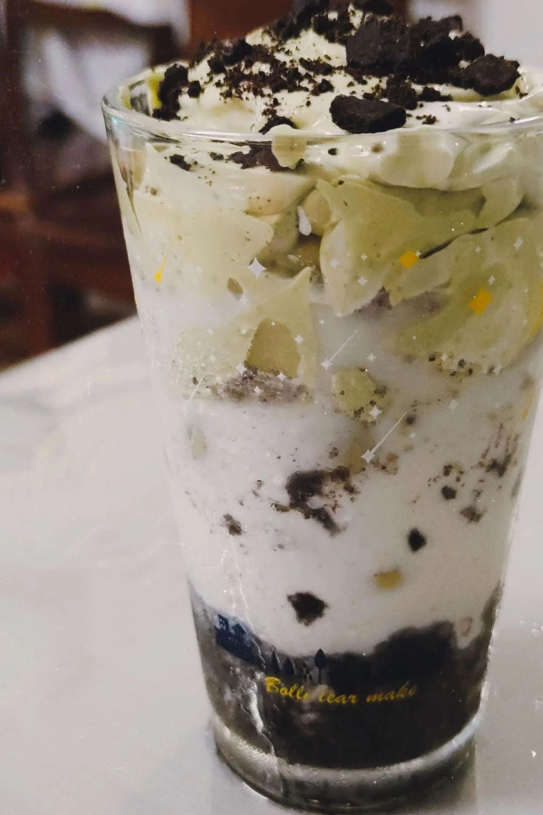 奥利奥碎加少少牛奶挂杯底,冰🧊块,牛奶,抹茶🍵粉+少少盐🧂+奶油+炼乳打匀,