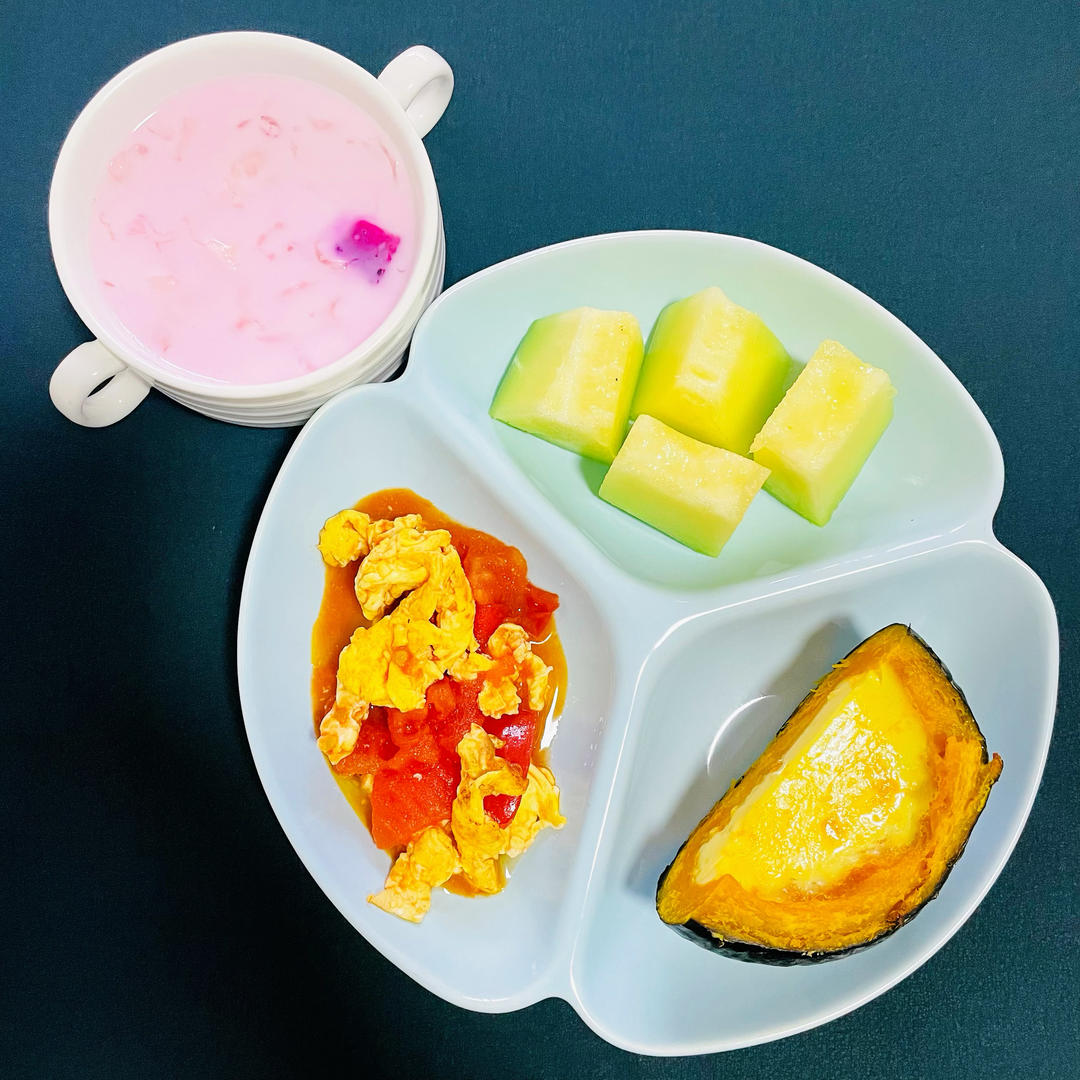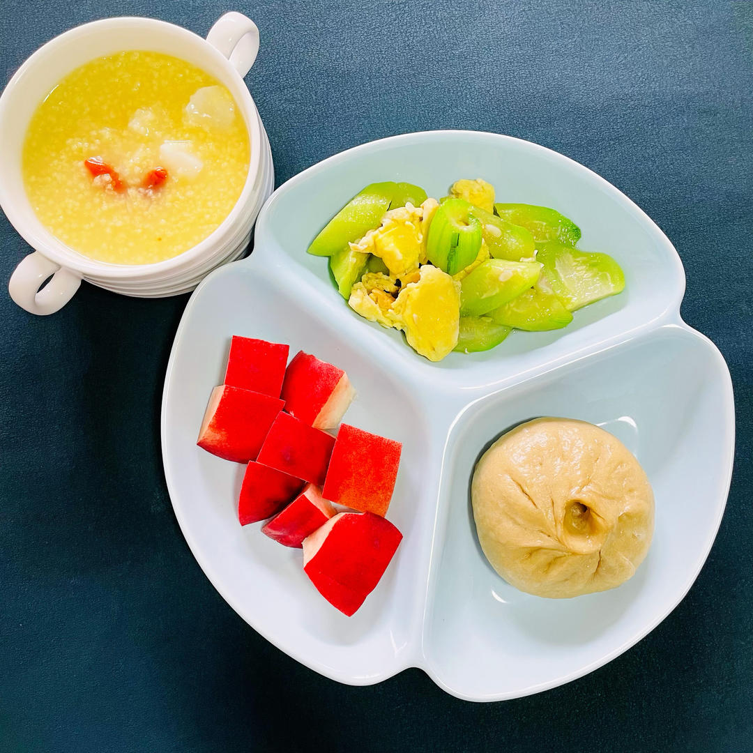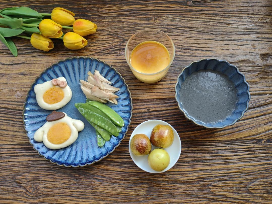 黑芝麻糊🥣+奶黄小馒头🍥+鸡肉🍗+荷兰豆🥗+鸡蛋羹🍮+冬枣