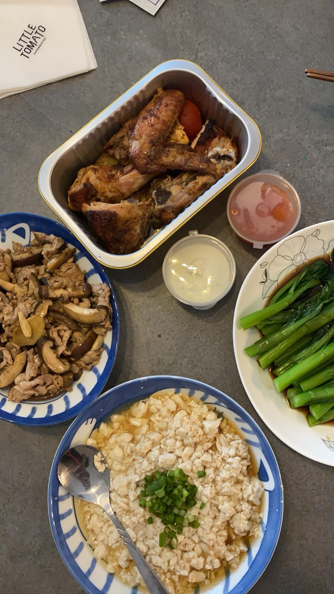 白灼菜心、凉拌豆腐、蘑菇🍄🟫炒肉、外卖烤鸡
