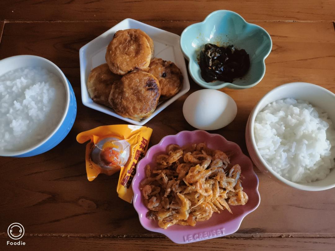 20240728早餐打卡1640:泡饭,牛肉火勺,炸河虾,黄瓜咸菜,鹅蛋,烤鸡蛋。早餐中国;#早餐•2024年7月28日...
