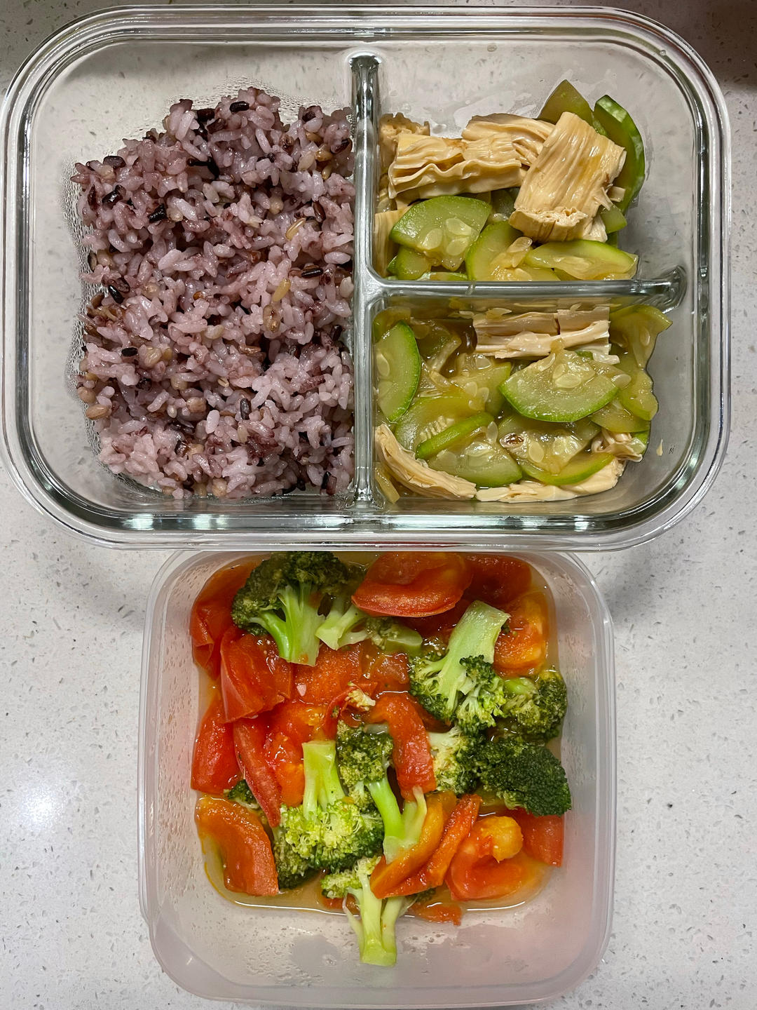 西葫芦炒腐竹+番茄西兰花