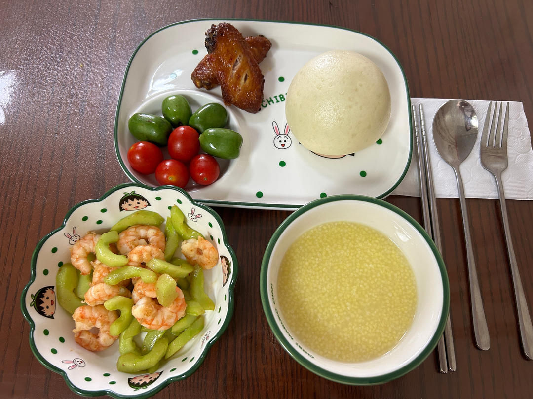 小米粥、虾仁炒黄瓜、豆沙包花卷、烤鸡翅、水果