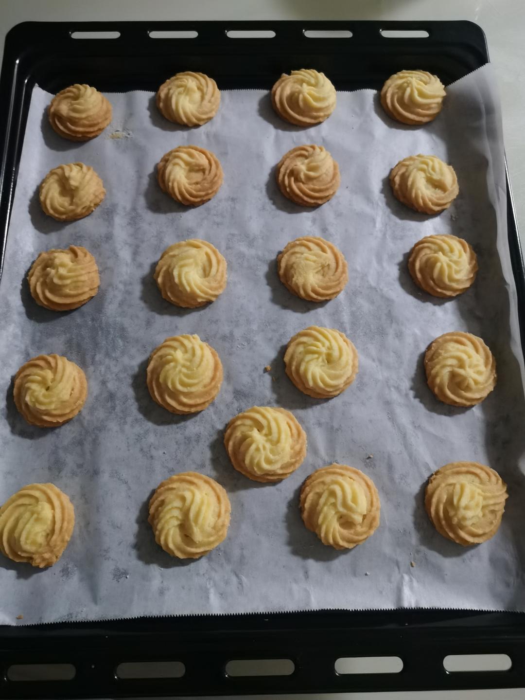 这是第二次尝试,第一次失败了,用了白砂糖,而且烤出来全塌了。这次老老实实用糖粉,老师的配方真的很好,虽然这次还是塌了一些...