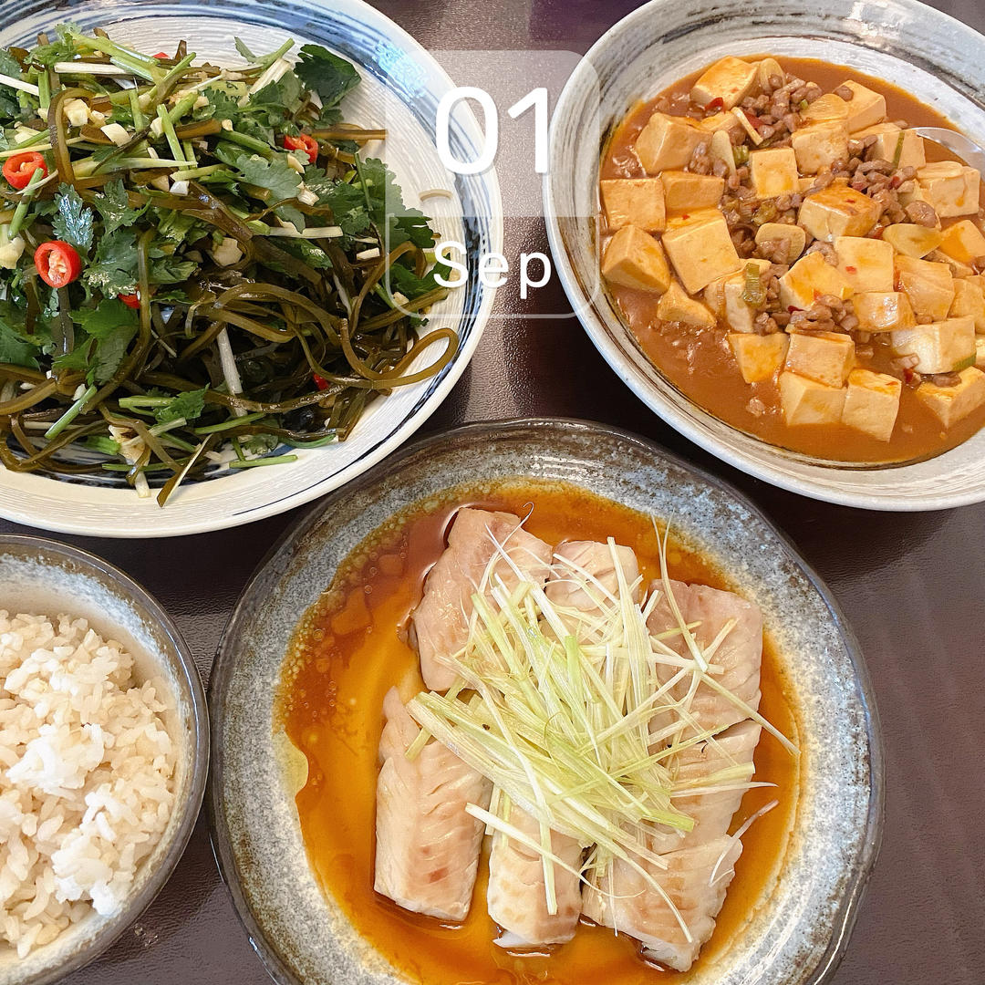 9月你好!简单晚餐,凉拌海带丝、清蒸鳕鱼、肉末豆腐。