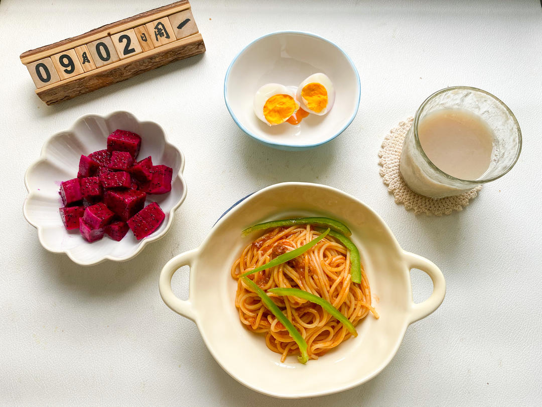 番茄肉酱意面,红心火龙果,水煮蛋,山药粉