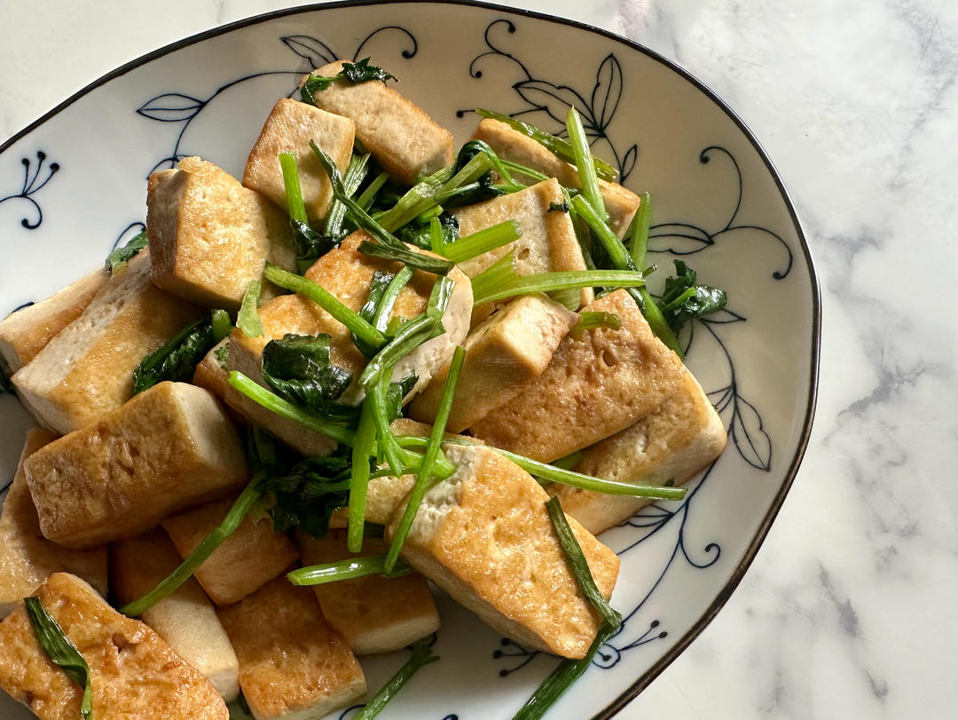 豆腐中小火煎至金黄,加入葱段一起煎香,加入酱油炒匀后再加入香菜段炒软,关火起锅。