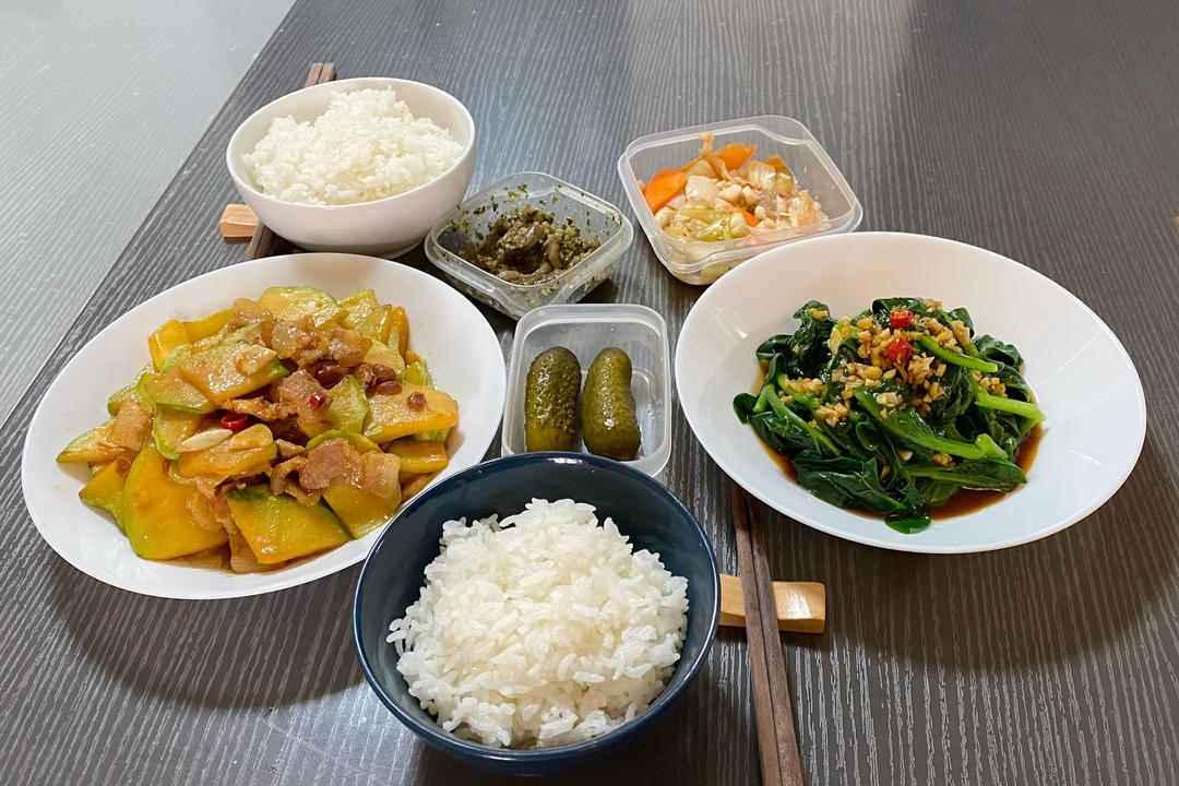 二人餐:酱香五花肉烧南瓜,凉拌木耳菜,主食米饭。