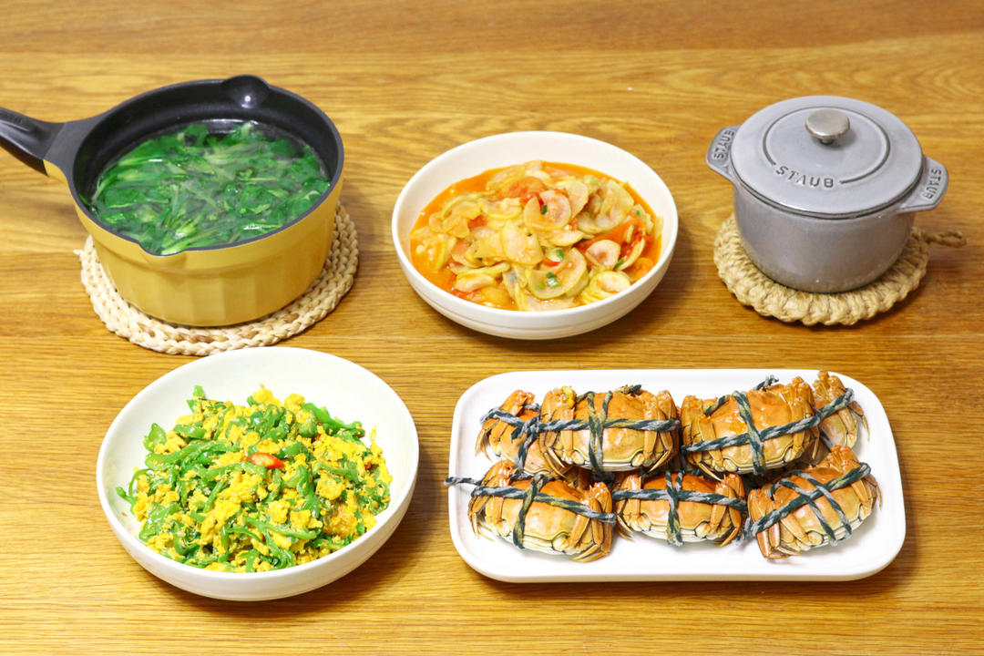 清蒸河蟹,西红柿炒瓠子,青椒炒蛋和鸡毛菜汤🦀