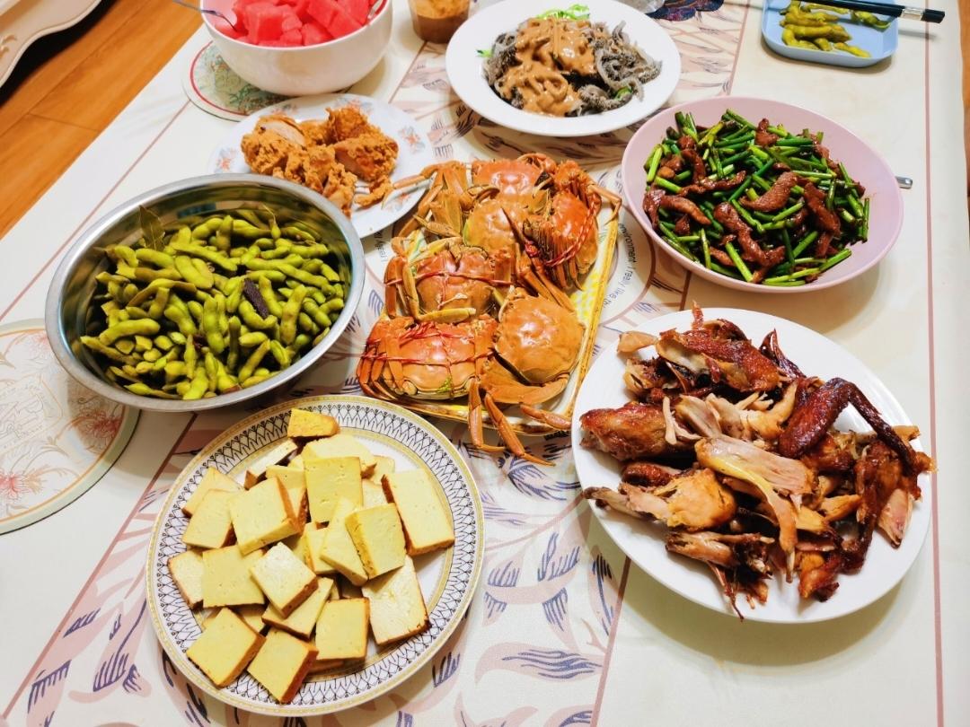 继续吃螃蟹,蒜苔炒肉,炸鸡腿🍗,香酥鸡,水爆肚,素鸡豆腐,煮毛豆