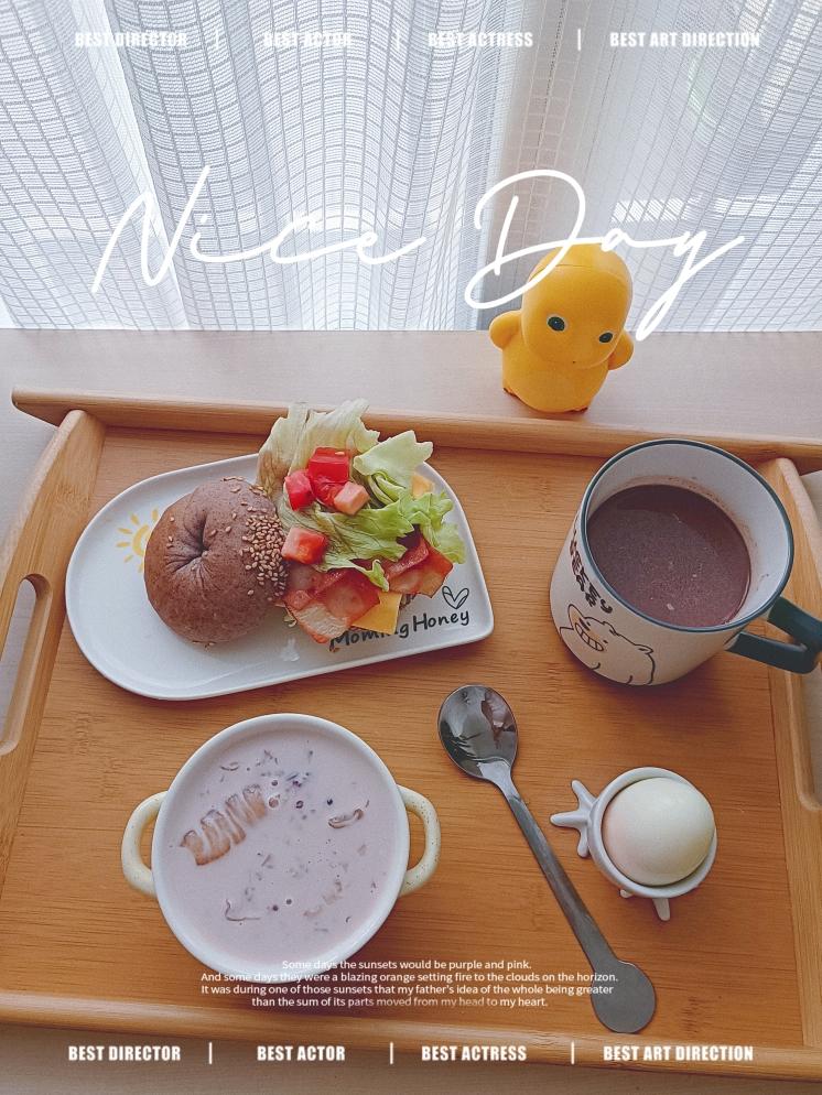 今日学生早餐~黑米奶盐芝麻贝果(培根+芝士片+西红柿丁+生菜)、煮蛋、花胶银耳囊、巧克...