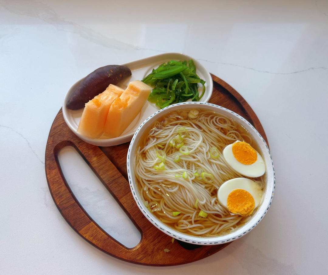 阳春面,烤地瓜,海藻沙拉,水煮蛋