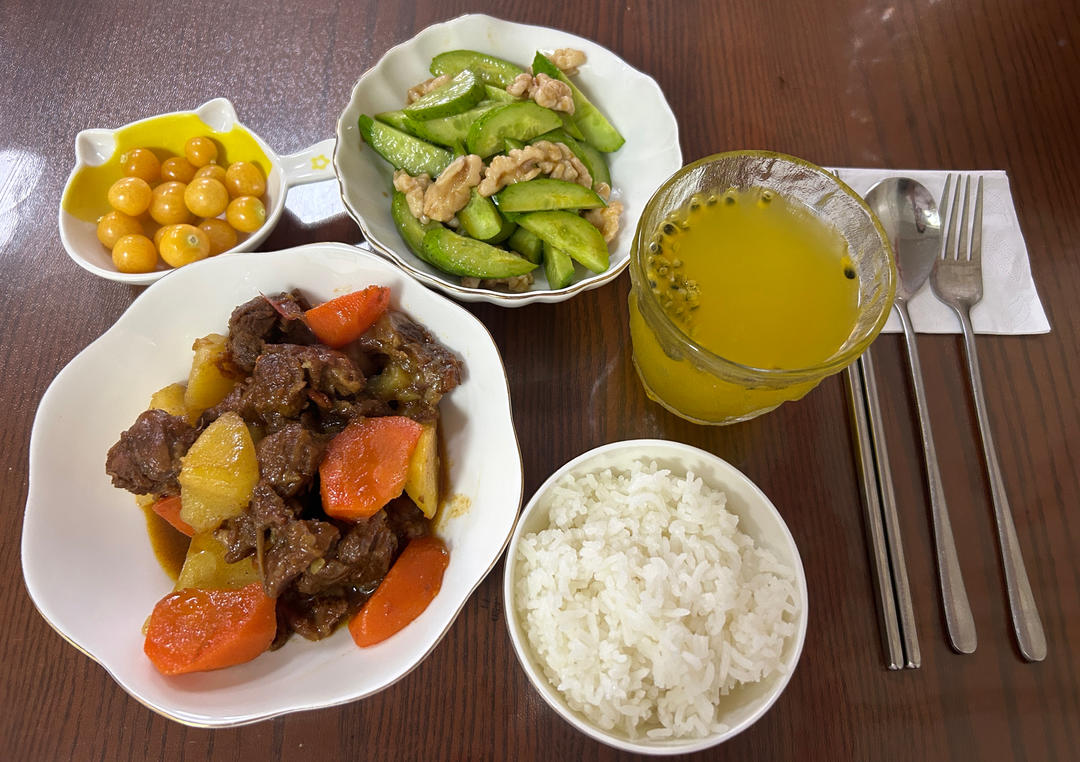 沙茶酱焖牛肉 米饭 桃仁拌黄瓜,百香果汁,甜姑娘