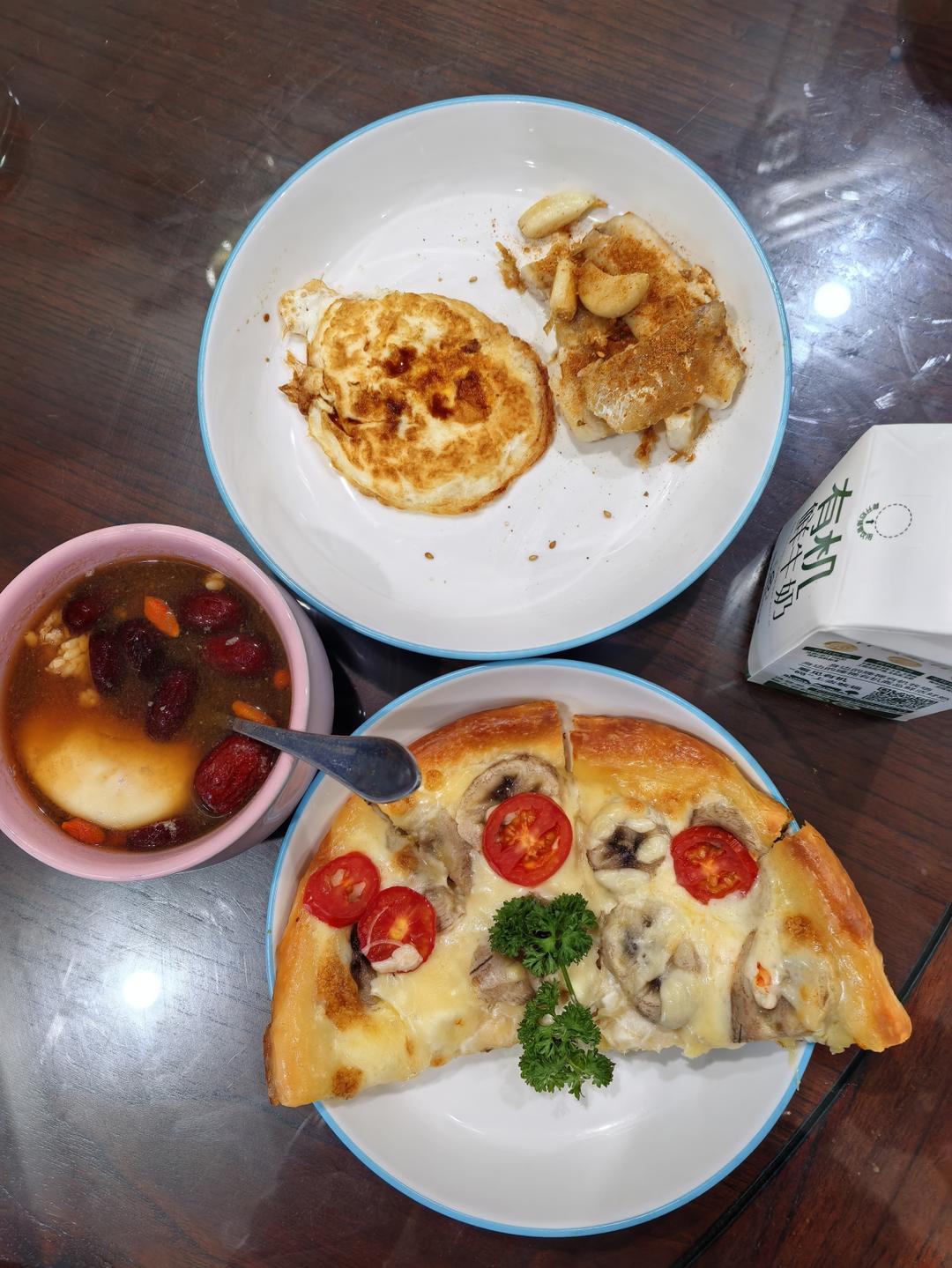 煎蛋,煎鱼排,披萨,奶,醪糟鸡蛋