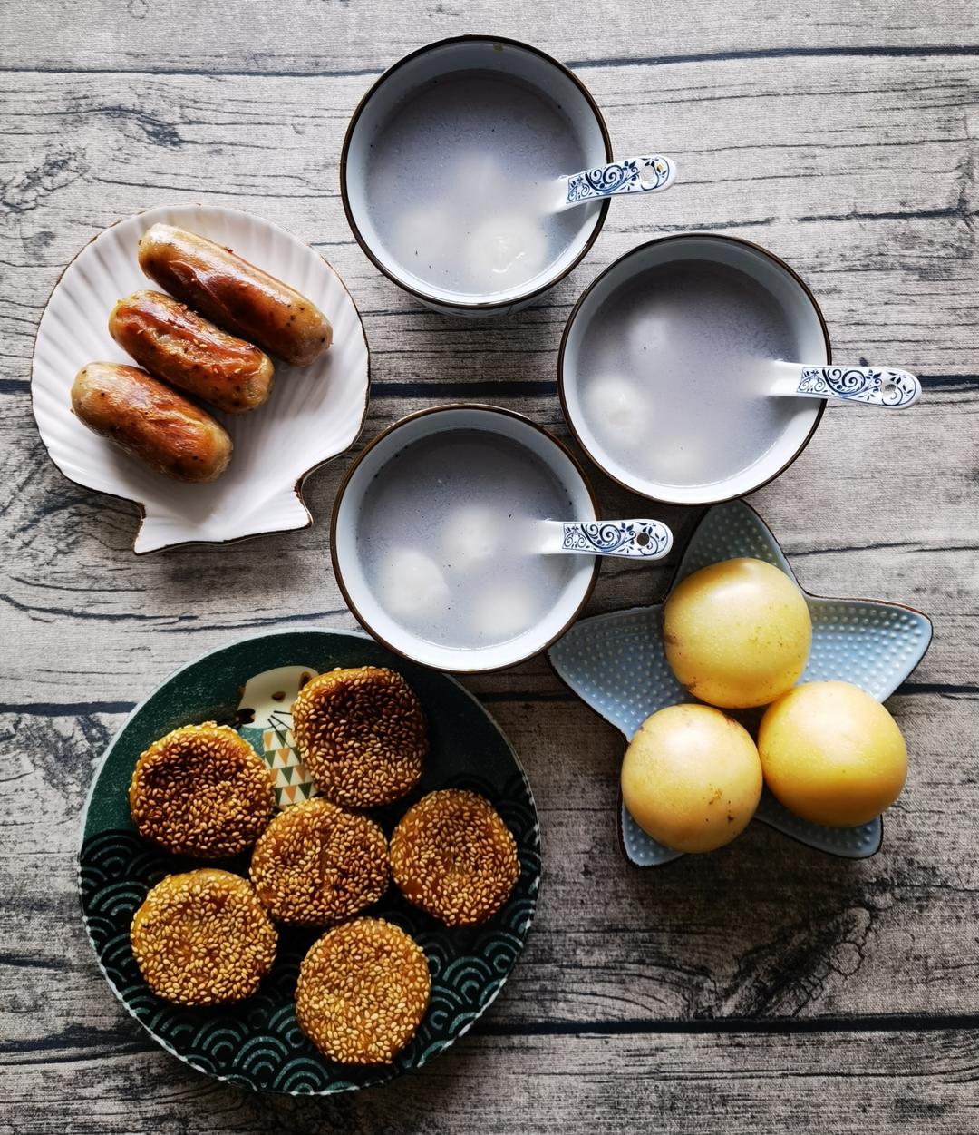 第2787餐:芝麻汤圆、南瓜饼、黑椒烤肠、人参果!