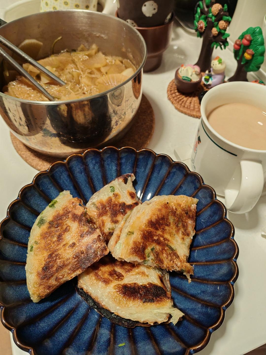 葱油饼搭萝卜粉丝汤,香椰拿铁