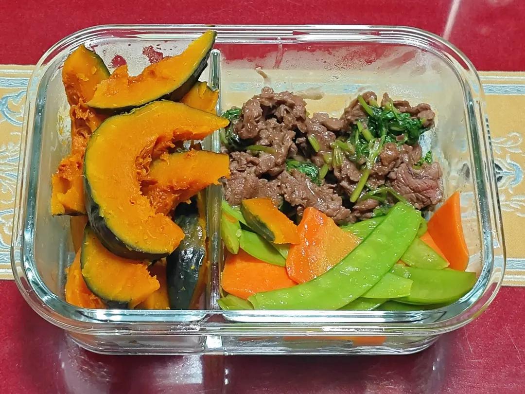 🍱 贝贝南瓜+芹菜炒牛肉+荷兰豆炒胡萝卜