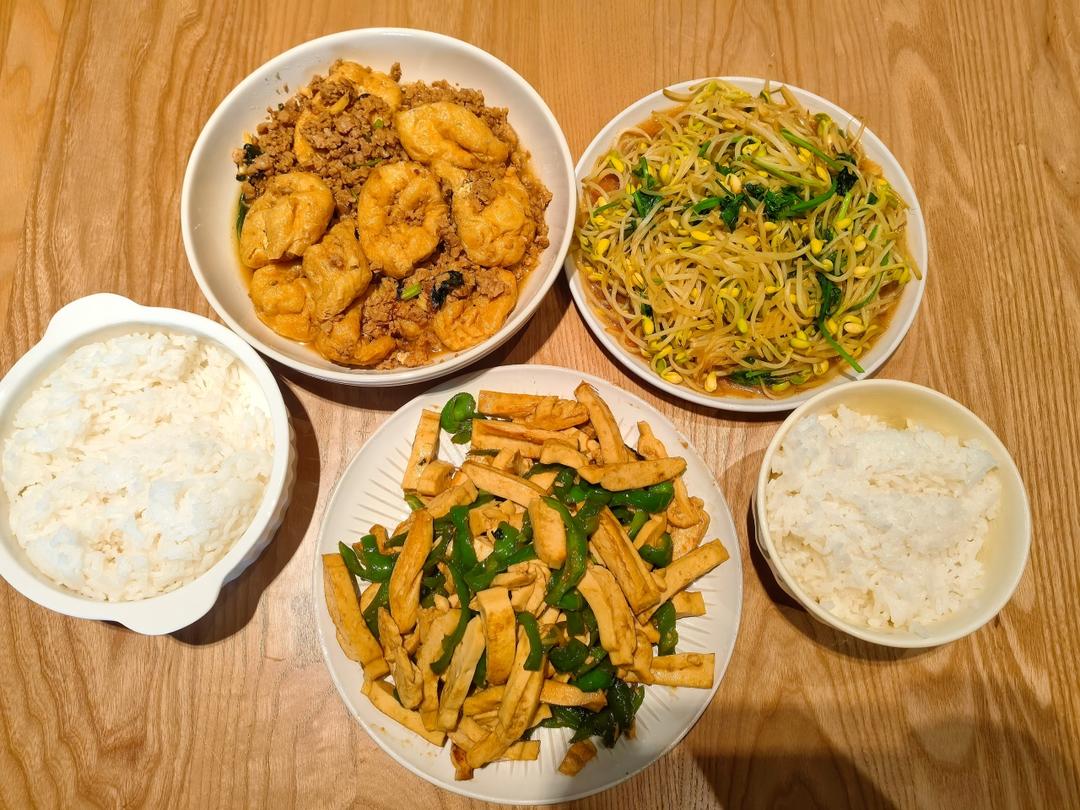 紫苏肉沫焖豆泡,辣椒炒白豆干,清炒豆芽