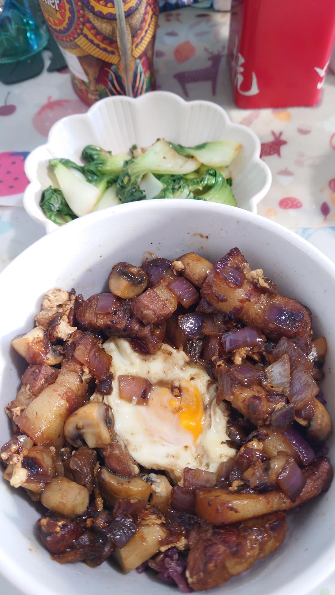 清炒油麦菜,蘑菇炒肉,西红柿炒蛋,米饭。