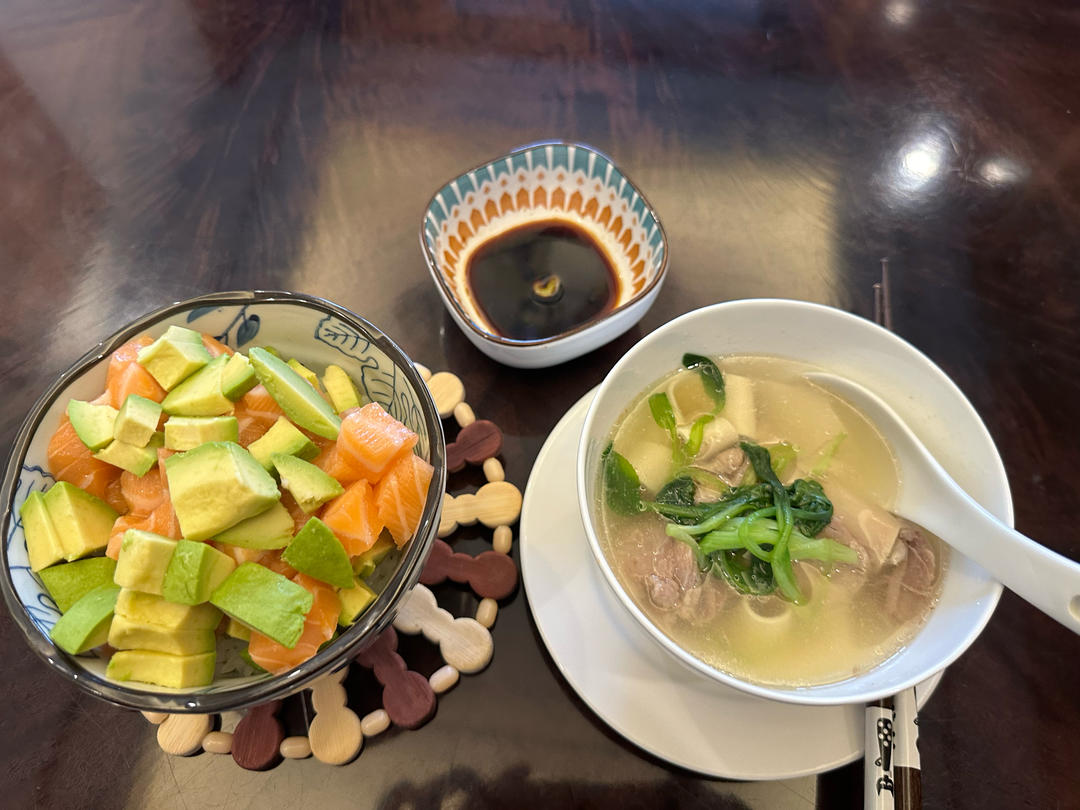 吞金兽午餐/牛油果三文鱼盖饭,猪骨汤