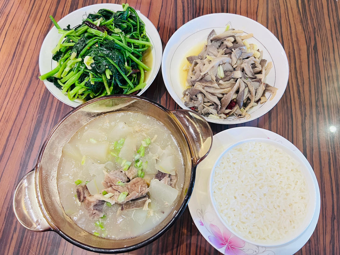 清炒菠菜,清炒蘑菇,冬瓜排骨汤,米饭。