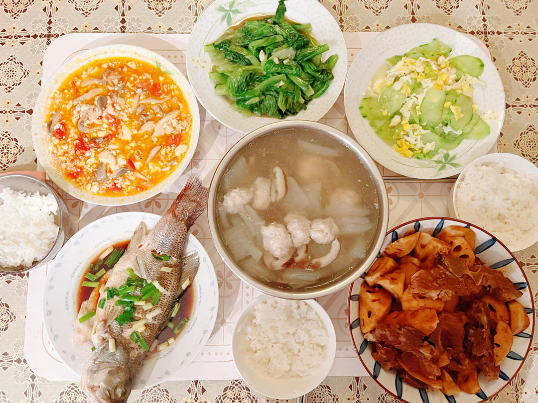 今日份:清蒸鲈鱼,莲藕烧排骨,黄瓜炒鸡蛋,蚝油生菜,茄汁平菇肉末豆腐和冬瓜香菇丸子汤。...