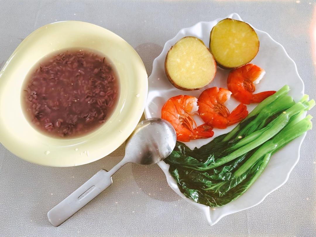 红薯,黑虎虾,烫菜心,青稞紫米酒酿