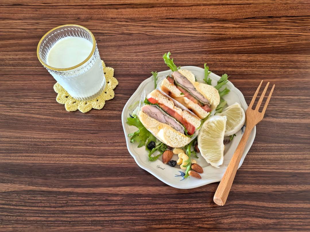 腿肉贝果三明治🥪+药柚+坚果+纯奶🥛
