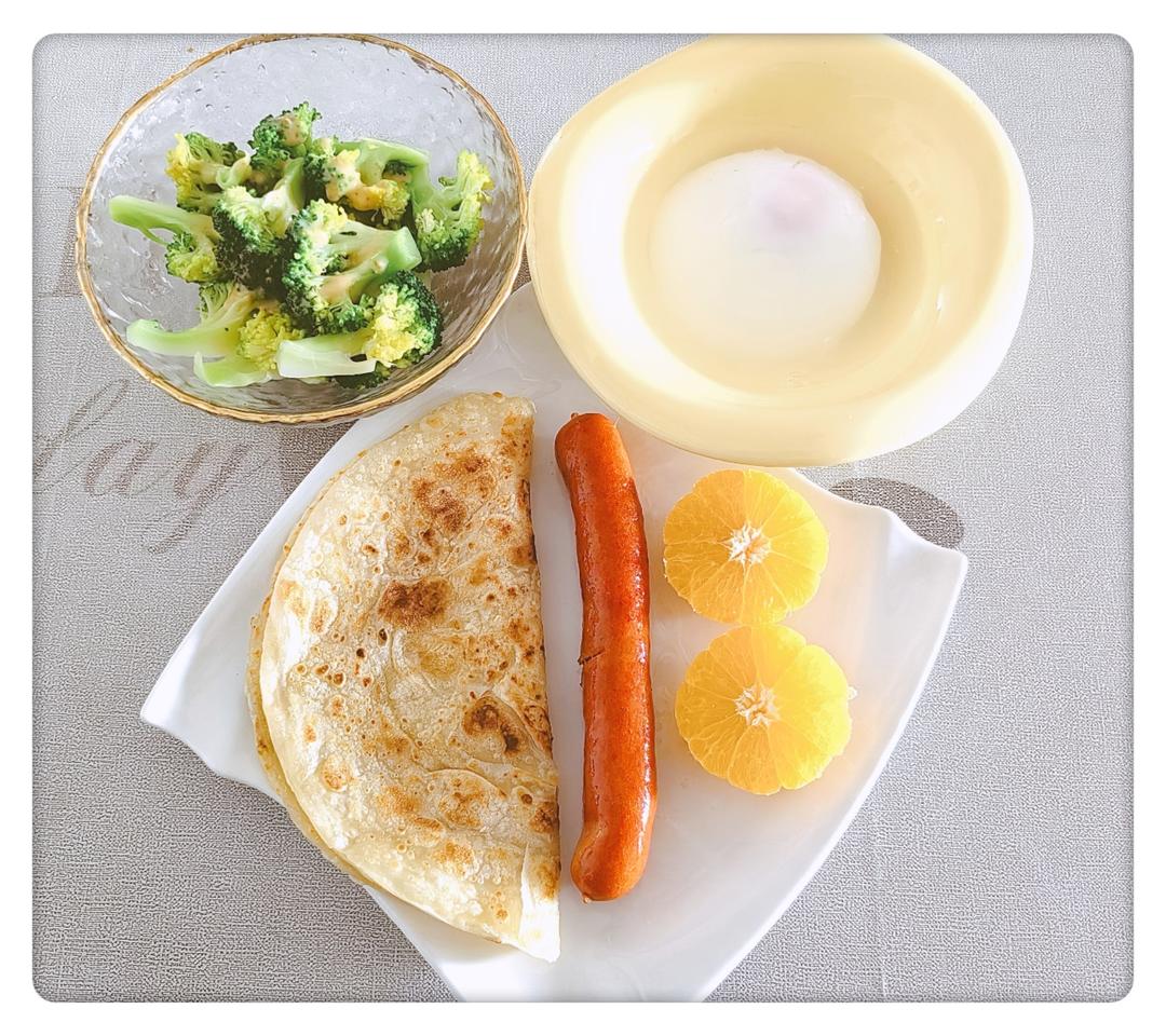 手抓饼,香肠,水波蛋西兰花,沙糖桔