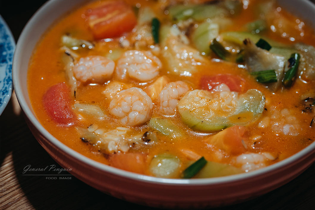 这次用虾仁做的,放了点儿丝瓜和番茄,让汤汁更多一些,大热天的,吃起来非常舒服。
