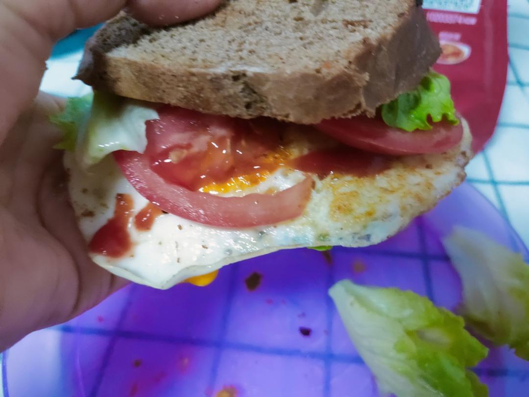 最简单的食材~西红柿🍅切片儿,煎鸡蛋🍳,生菜叶,火山石烤肠,大列巴面包片,番茄酱。简单快手省事儿的早餐#早餐•2024年...