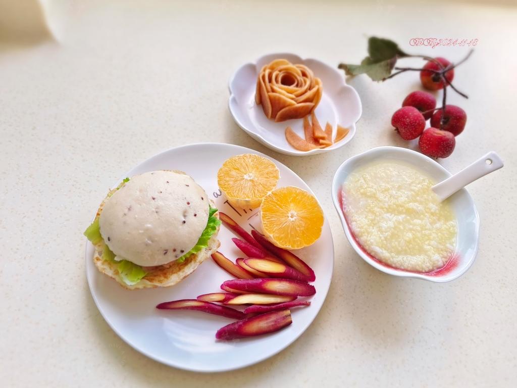 今日早餐:虾饼煎蛋藜麦馒头堡,金银米粥,酱渍萝卜片,果蔬~