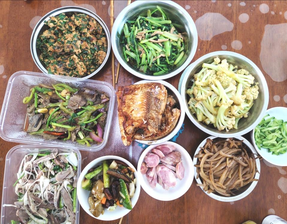 今日午餐:萝卜炒五花肉、白灼大虾、平菇炒肉片、蒜黄炒鸡蛋。