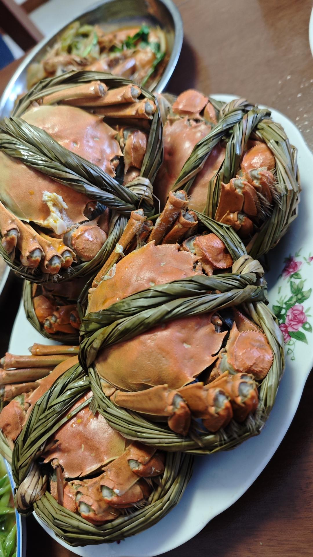 今日午餐-大闸蟹,酱爆八爪鱼,海蛎子粉条炖茼蒿,烤地瓜,芋头
