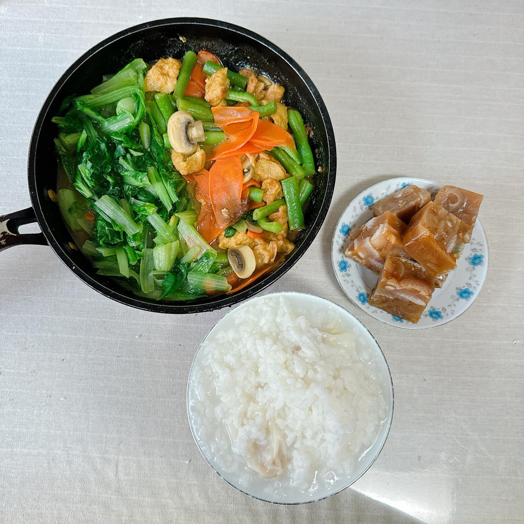 青菜,胡萝卜,口蘑,豆角,油豆腐,油面筋+咖喱块。