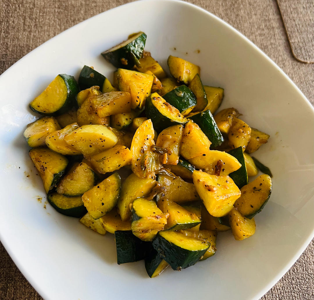 炒绿皮西葫芦和黄皮西葫芦,煎鱼片,配米饭