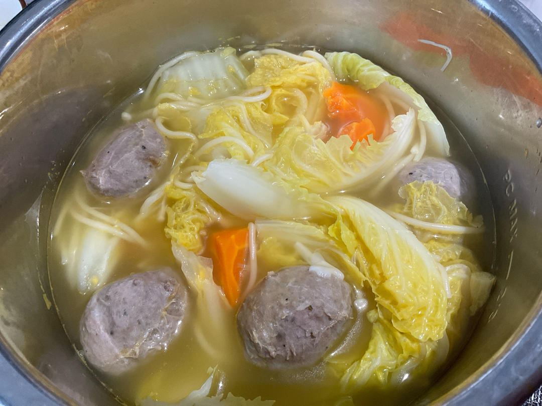 最后一包酸汤嚯嚯完,超级美味的酸汤意面锅,有牛筋丸,🥕还有娃娃菜,金针菇,天冷的时候吃...