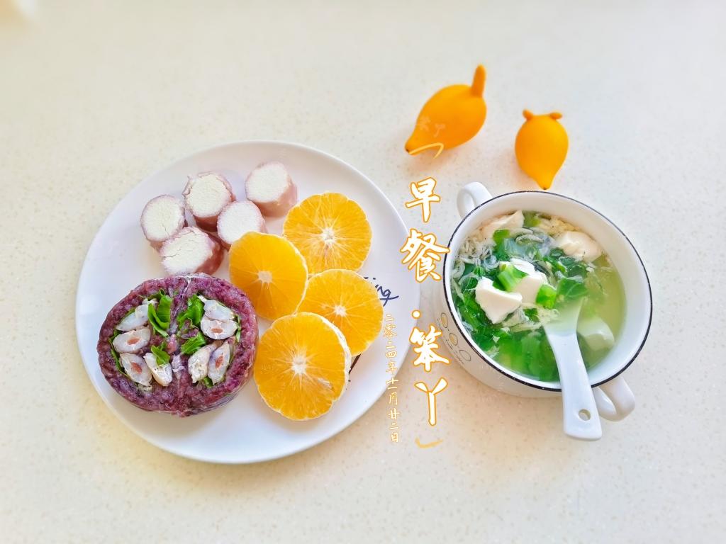 今日早餐:蒸山药,紫米爬虾肉饭团,虾...