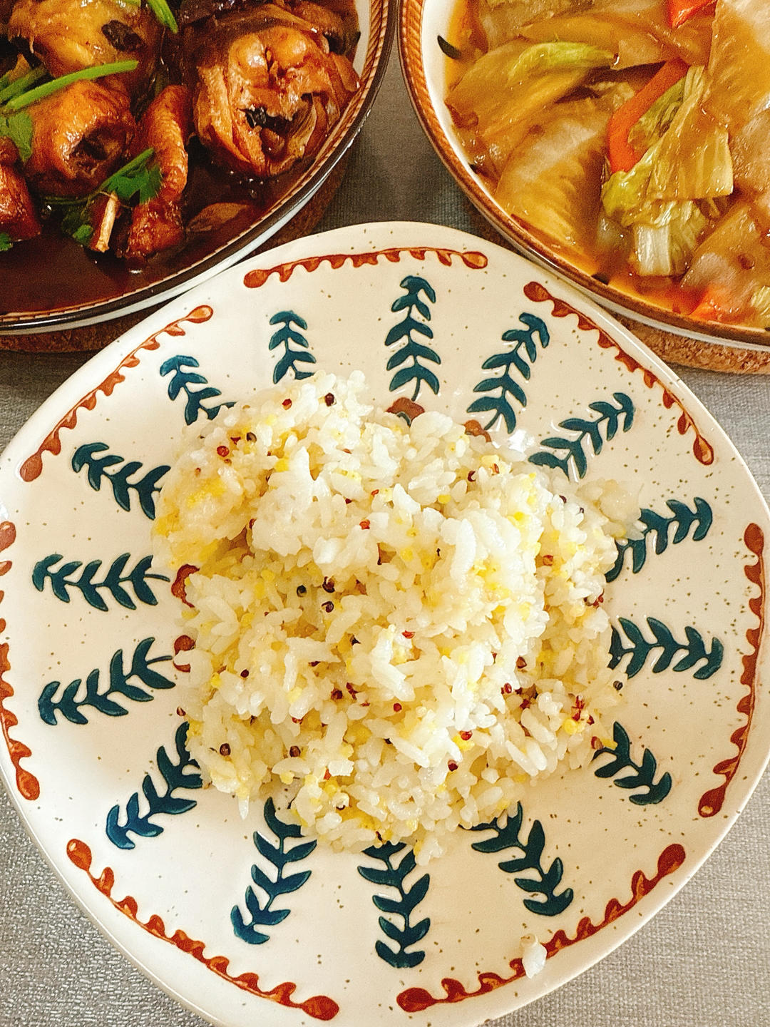 芝麻盐拌梅豆、鸡肉炖土豆