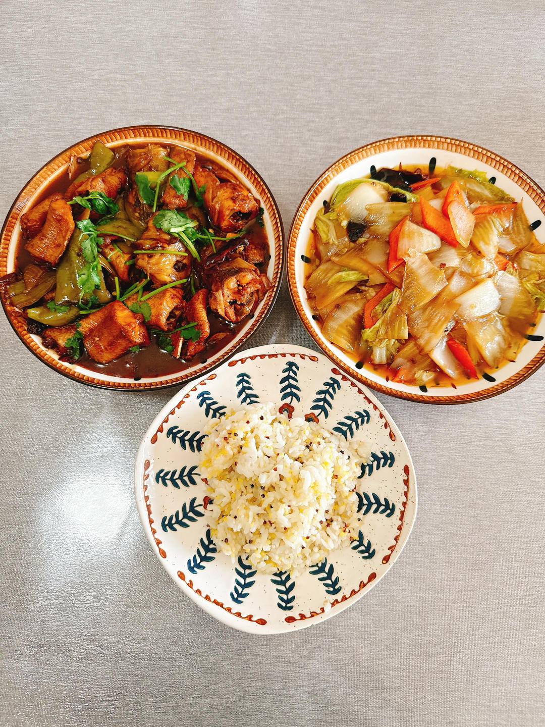 土豆、胡萝卜炒螺丝椒,大白菜、粉条炖狮子头