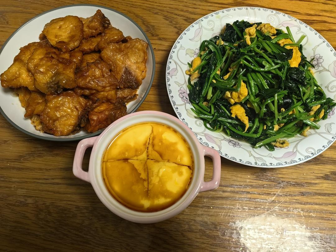 红烧青鱼块,菠菜炒鸡蛋,蒸蛋羹