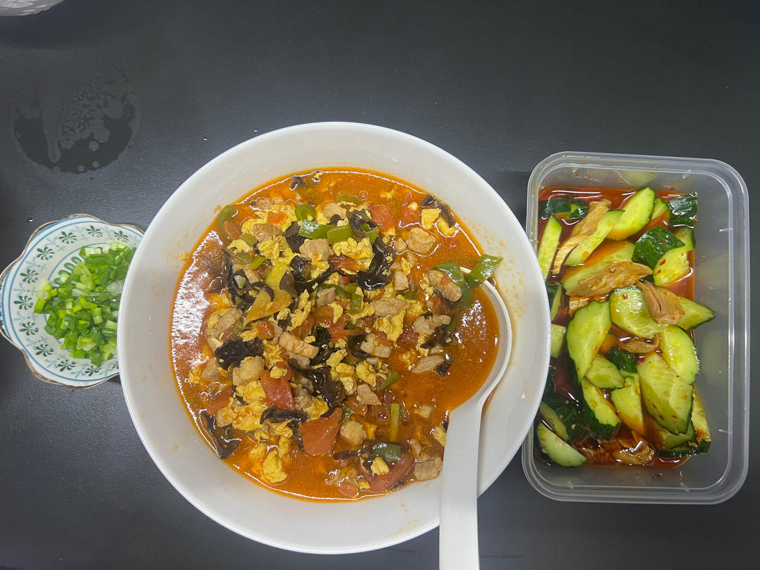 西红柿打卤面,只有西红柿鸡蛋太素了,加了肉丁、辣椒丁、木耳~