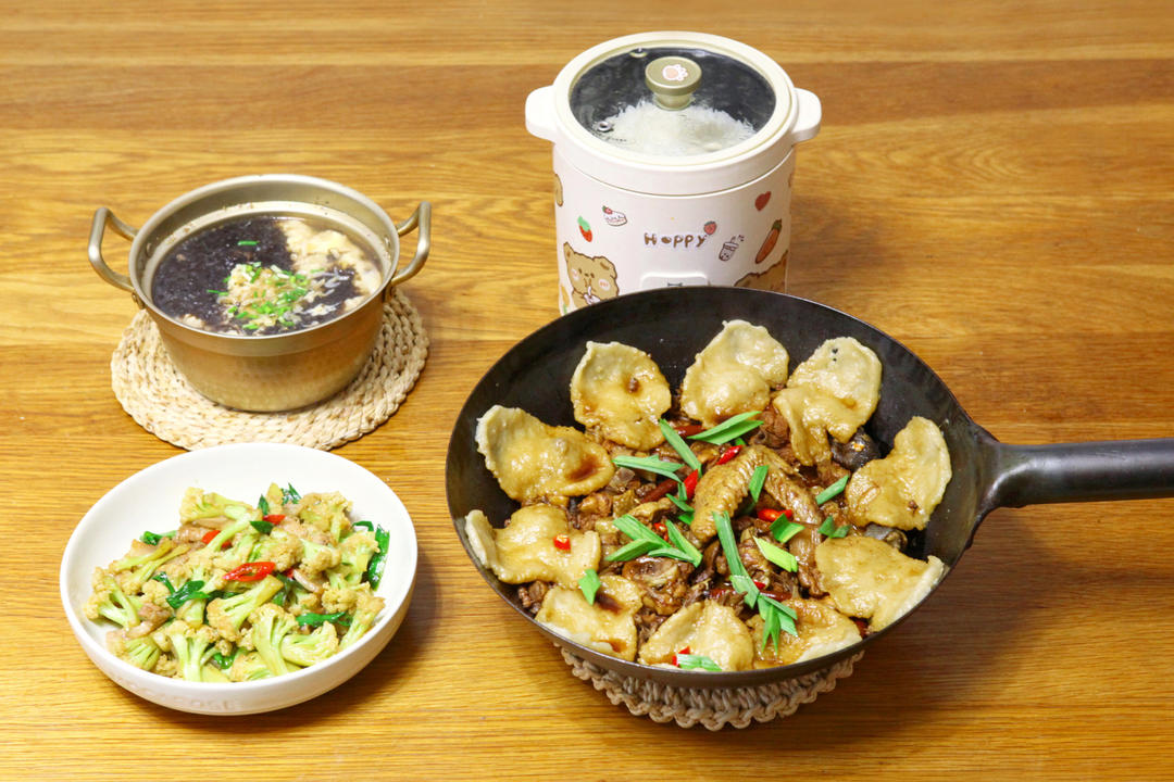 地锅鸡,花菜炒五花肉和紫菜蛋汤🐥