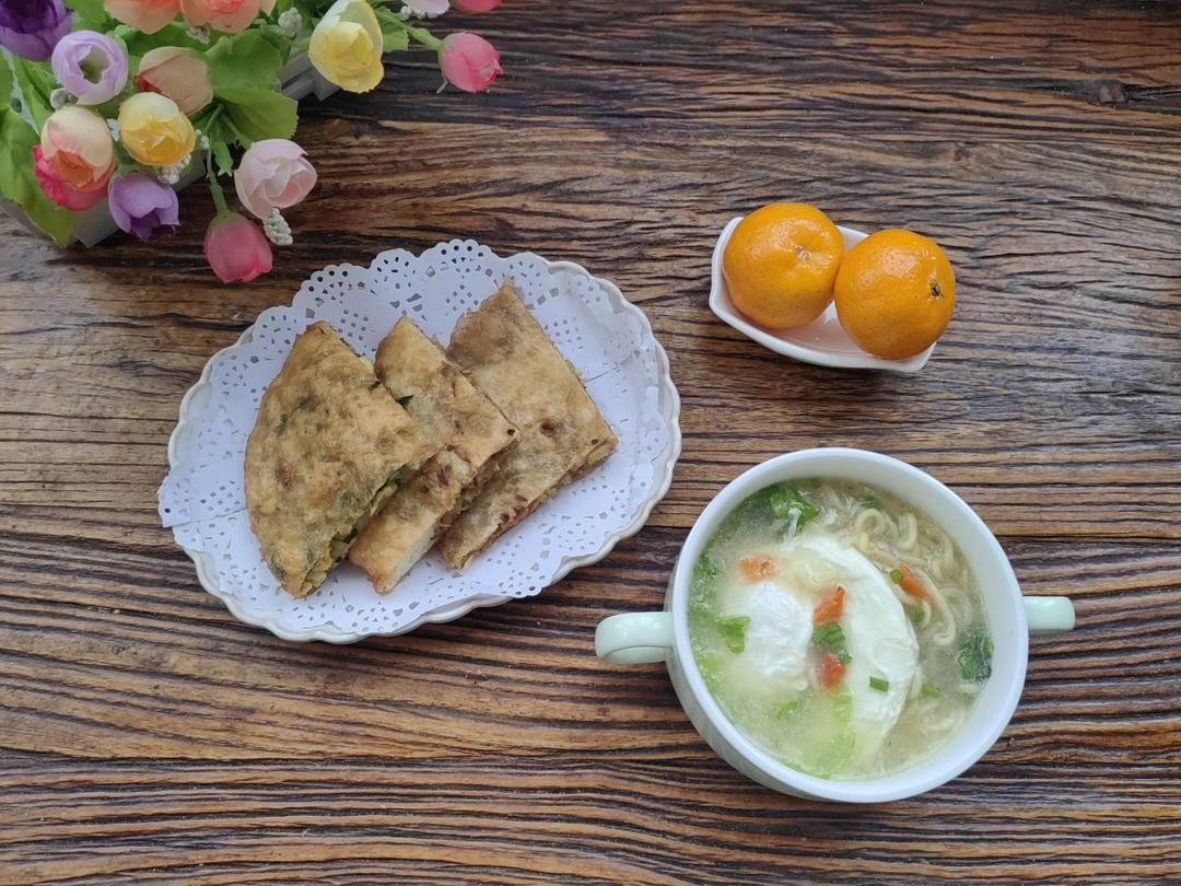 荷包蛋方便面🍜+馅饼🥙+小橘子🍊
