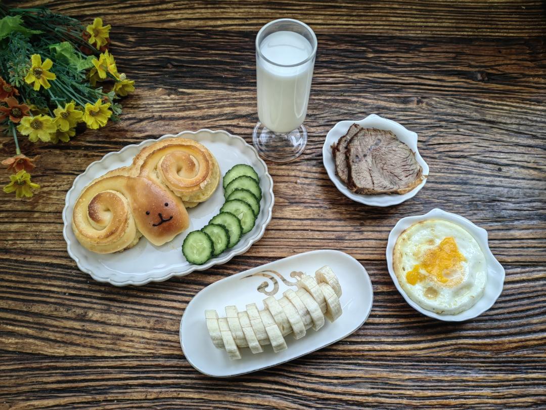 牛奶🥛+椰蓉小羊面包🥯+酱牛肉🥩+煎鸡蛋🍳+香蕉🍌