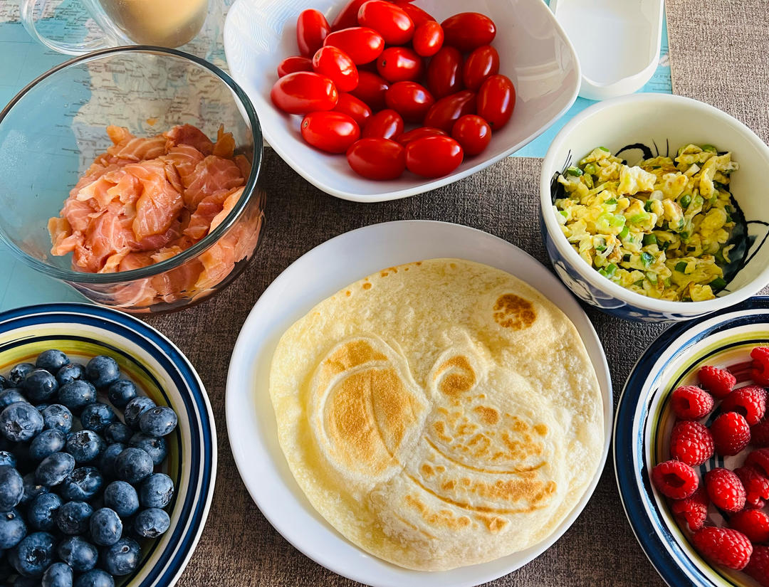 小饼,葱花炒鸡,烟熏三文鱼,小番茄,蓝莓,树莓,咖啡,丰富的早餐,早上和邻居一起在小区...