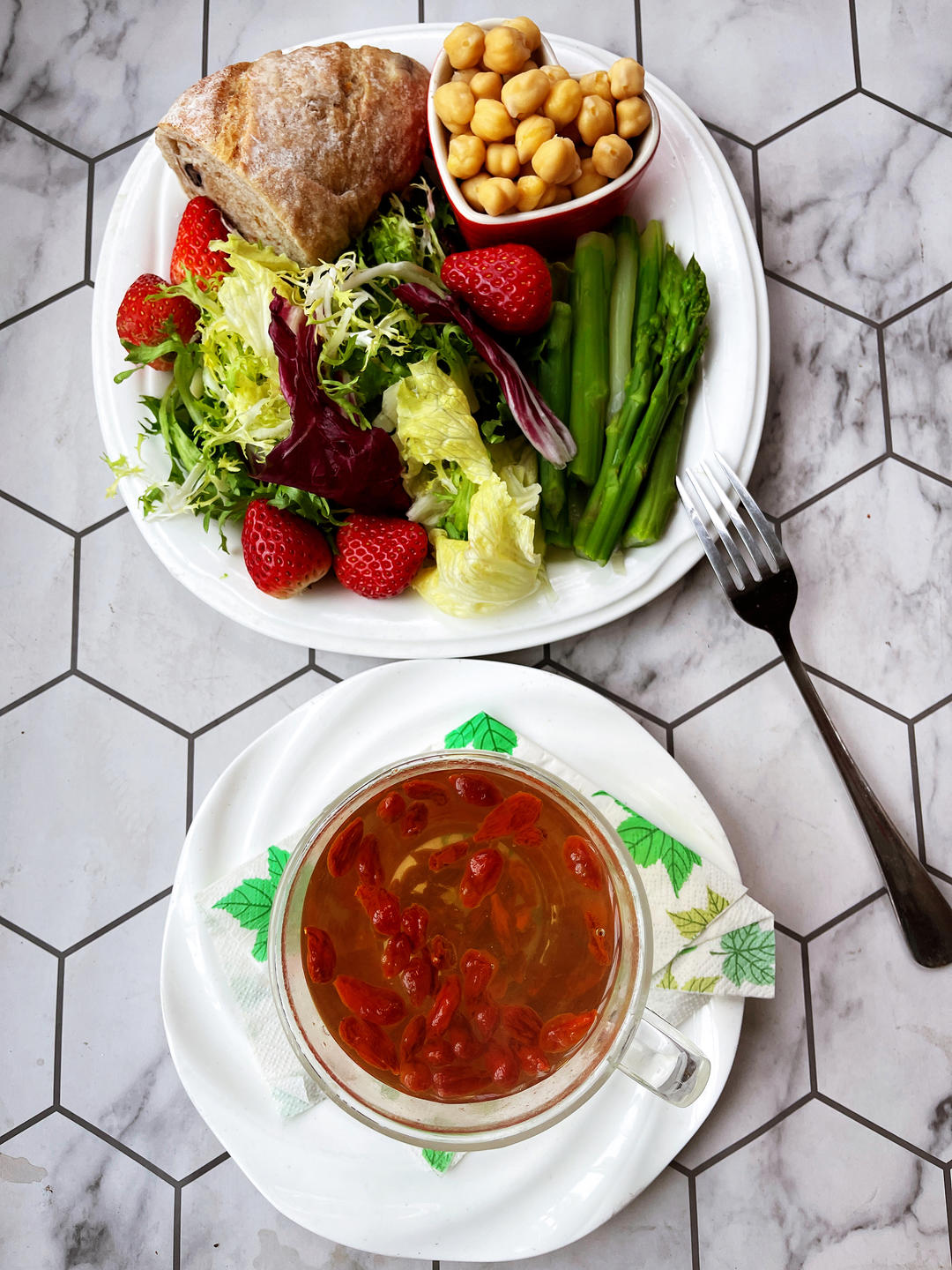 工作日早餐:杂蔬+芦笋+草莓+鹰嘴豆+果干软欧+枸杞水。