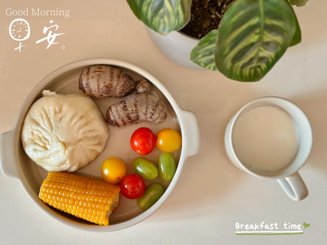 肉包+芋艿+玉米🌽+彩色小番茄🍅+牛奶🥛
