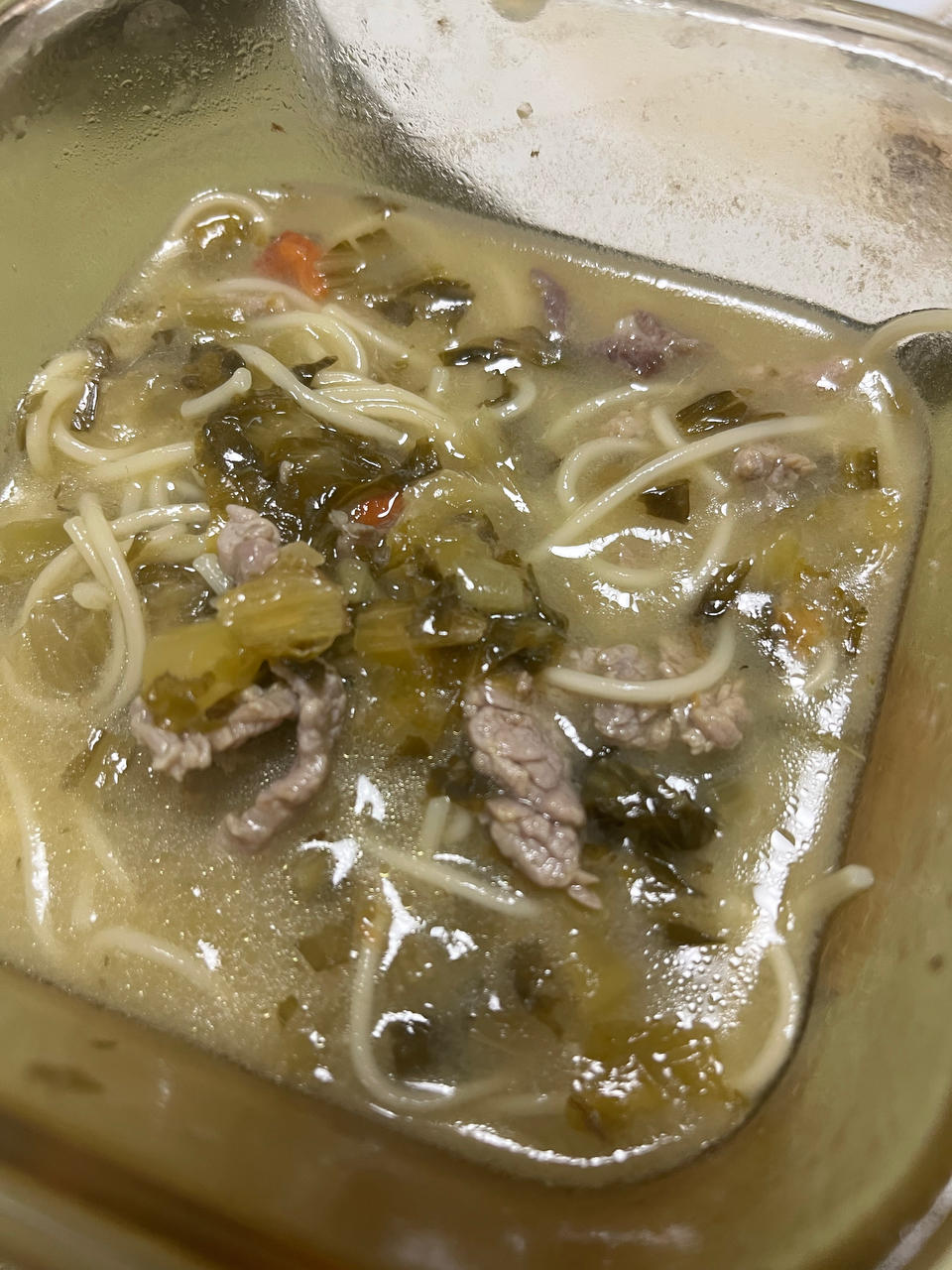 肉丝用盐、生抽和油稍微腌一会儿,炒变色后盛起来,待面条快熟时再倒入调味,肉丝很嫩